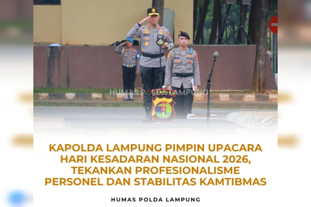 BANDAR LAMPUNG – Kosmiindonesia.com – Suasana khidmat dan penuh semangat menyelimuti halaman Mako Polda Lampung pada hari Jumat, 17 April 2026. Bertindak selaku Inspektur Upacara, Kapolda Lampung, Irjen Pol Helfi Assegaf, S.I.K., M.H., memimpin langsung pelaksanaan Upacara Bendera Hari Kesadaran Nasional Tahun 2026 yang diikuti oleh seluruh jajaran pimpinan dan personel di lingkungan Polda Lampung.