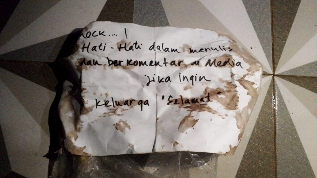 Tak berhenti sampai di situ, di antara bagian tubuh bangkai ayam yang tergeletak acak, Uchok menemukan selembar kertas bergaris yang tampaknya dicetak menggunakan mesin tik atau printer sederhana. Tulisan hitam yang jelas terbaca di atas kertas menyampaikan pesan ancaman yang tidak ambigu: “Berhati-hatilah dalam menulis dan berkomentar di media. Jika ingin keselamatan keluarga Anda tetap terjaga, hentikan semua yang kamu lakukan.” Tulisan tersebut tidak ditandatangani oleh siapapun, namun pesannya sangat jelas menyasar kepada aktivis yang telah selama bertahun-tahun menggeluti analisis dan pengawasan anggaran negara ini.
